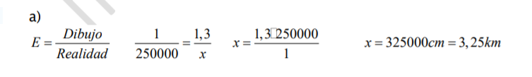- En un mapa de carretera la distancia entre dos ciudades es de 1,3cm, la escala del mapa es 1:250 000.