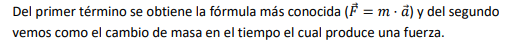 La expresión de la Segunda ley de Newton que hemos dado es válida para cuerpos cuya masa sea constante (no varía). Si la masa cambia, como por ejemplo un cohete que va quemando combustible, no es válida la ecuación anterior. Vamos a generalizar la Segunda ley de Newton para que incluya el caso de sistemas en los que pueda variar la masa.