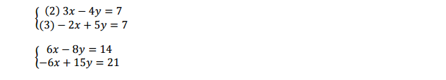 - Escogemos una de las incógnitas, y multiplicamos cada una de ellas por un número que me permita tener la misma incógnita de ambas ecuaciones con un coeficiente común (es decir, el mismo número multiplicando).