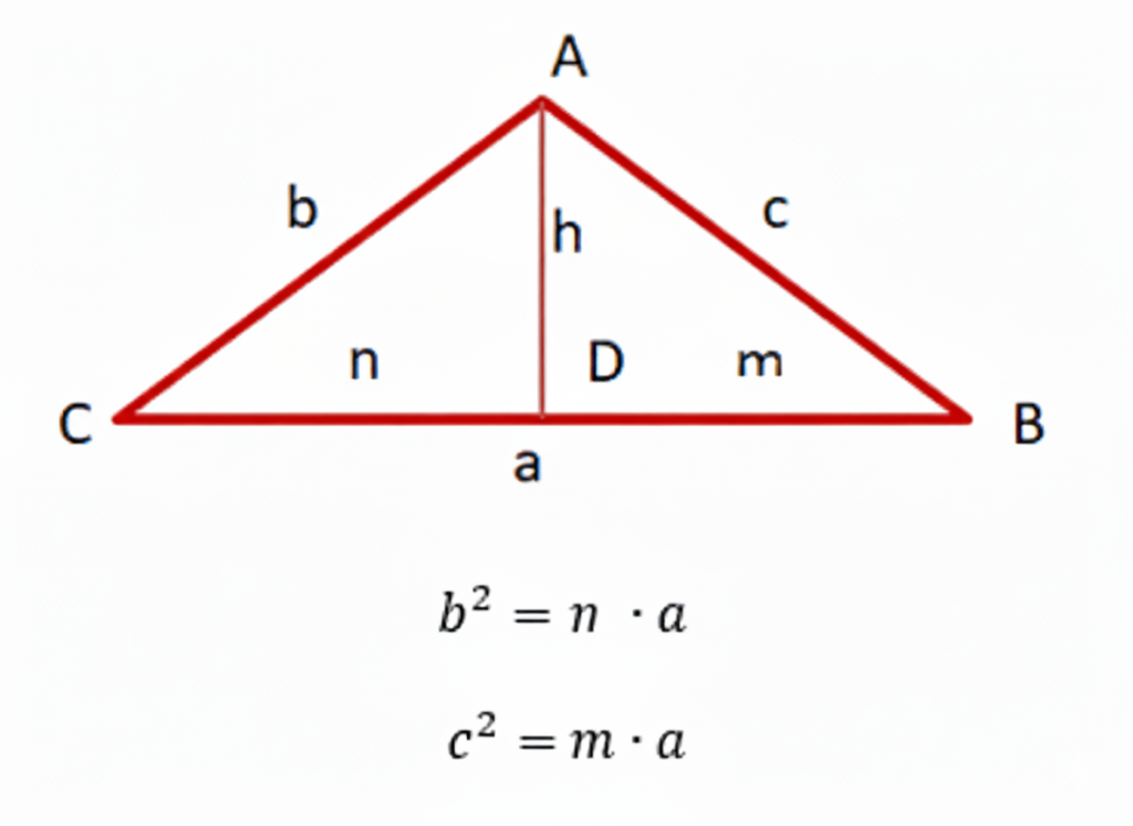 Al trazar la altura correspondiente a la hipotenusa se forman 2 triángulos rectángulos interiores. Usando que los 3 triángulos, el grande (de vértice ABC) y los 2 interiores (de vértices ACD y ABD), son semejantes (ya que tienen los ángulos respectivos iguales) se obtienen 2 teoremas: