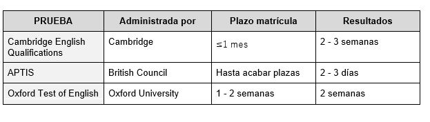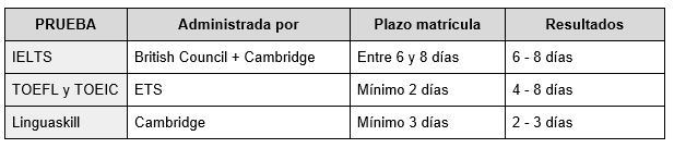 - Corrección y resultados en los plazos más cortos disponibles, entre 2 y 8 días según la prueba. Esto lo hace tanto más favorable para aquellos que necesiten aportar una prueba oficial de inglés en poco tiempo.